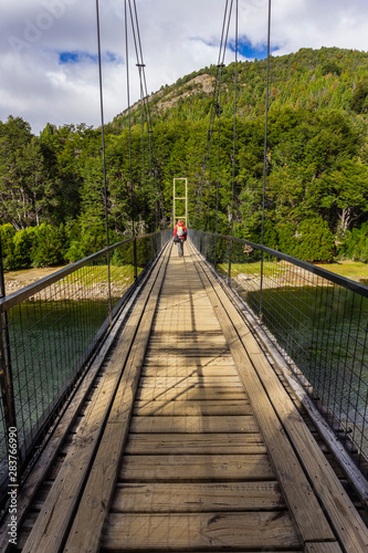 © Pedro Suarez, Obraz premium Widok z tyłu młodej kobiety ćwiczącej piesze wędrówki w plecaku przez drewniany most wiszący nad szeroką rzeką w Parku Narodowym Los Alerces, Patagonia, Argentyna