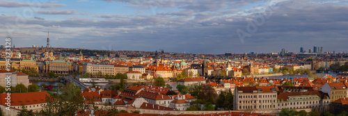 © Mykola Iegorov, Obraz premium Widok zachodzącego słońca na panoramę starego miasta z mostami i Wełtawą z zamku Hradczany. Skyline of Prague, Republika Czeska. Szeroka panorama.