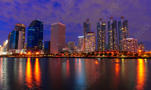 © Atakorn, Naklejka premium Widok zakładu Benjakiti Park nocą w Bangkoku w Tajlandii.