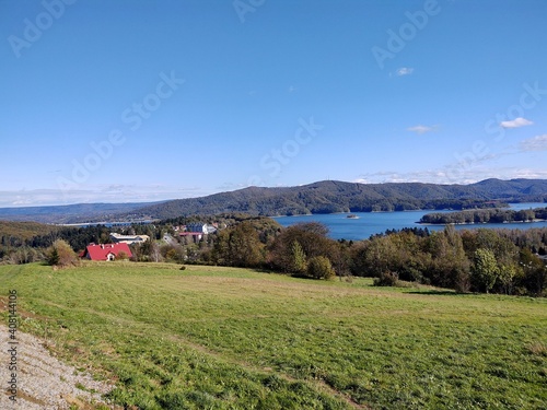 Obraz premium Widok ze wzgórza na jezioro i lasy
