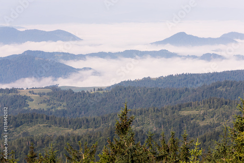 Fototapeta premium Widoki z Radziejowej, mgła i szczyty górskie