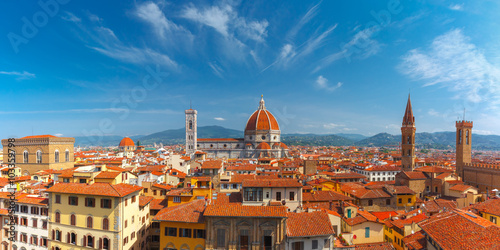 © Kavalenkava, Naklejka premium Widokowa panorama z lotu ptaka Duomo Santa Maria Del Fiore, Badia Fiorentina i Bargello rano z Palazzo Vecchio we Florencji, Toskania, Włochy