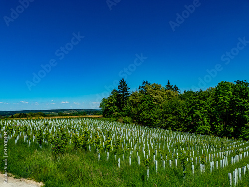 Fototapeta premium Wiederaufforstung durch Anpflanzen junger Laubbäume am Waldrand