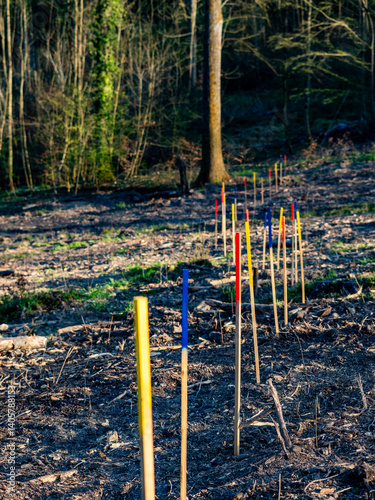 Fototapeta premium Wiederaufforstung im Frühjahr mit bunten Markierungsstöcken