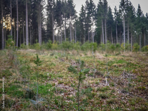 Fototapeta premium Wiederaufforstung im Mischwald durch anpflanzen von Jungbäumen