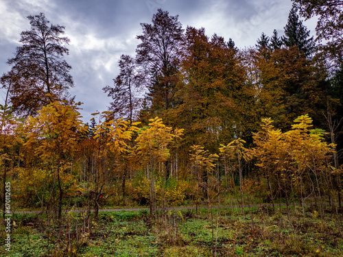 Fototapeta premium Wiederaufforstung im Mischwald durch anpflanzen von jungen Bäumen