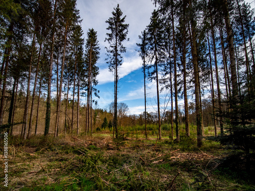 © focus finder, Obraz premium Wiederaufforstung im Mischwald im Frühjahr