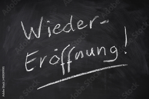 © Axel Bueckert, Obraz premium Wiedereröffnung in Handschrift auf Kreidetafel geschrieben