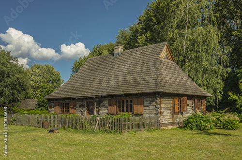 © kemot70, Obraz premium wiejska chata / wiejski domek z ogródkiem i okiennicami pod lasem