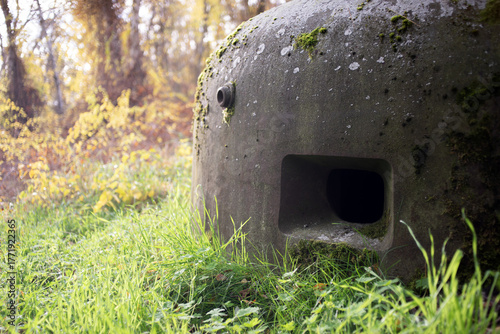 © qrrr, Fototapeta premium Wielka gruba stalowa kopuła starego powojennego bunkra stanowiąca pancerz ochraniający żołnierza na tle jesiennych barw