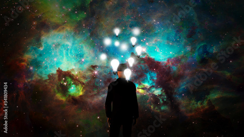 © rolffimages, Fototapeta premium Wielkie pomysły. Mężczyzna w czarnym garniturze przed jaskrawą mgławicą