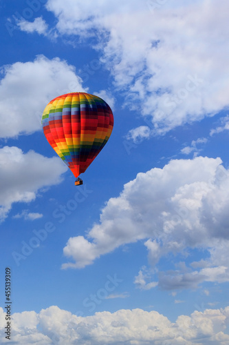 © Sergii, Obraz premium Wielokolorowy balon na ogrzane powietrze unosi kosz z turystami na niebieskim niebie. Obraz pionowy.