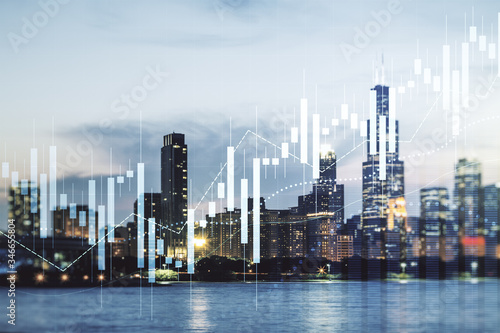 © Pixels Hunter, Fototapeta premium Wielokrotna ekspozycja wirtualnego kreatywnego hologramu wykresu finansowego na tle drapaczy chmur w Chicago, koncepcja badań i analiz