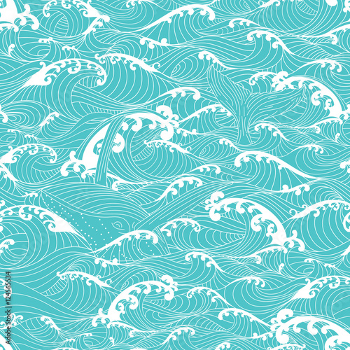 Obraz premium Wieloryb pływanie w falach oceanu, bezszwowe tło wzór