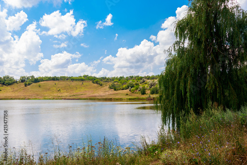 © olyasolodenko, Naklejka premium Wierzba płacząca lub wierzba Babylon (Salix Babylonica) na brzegu jeziora