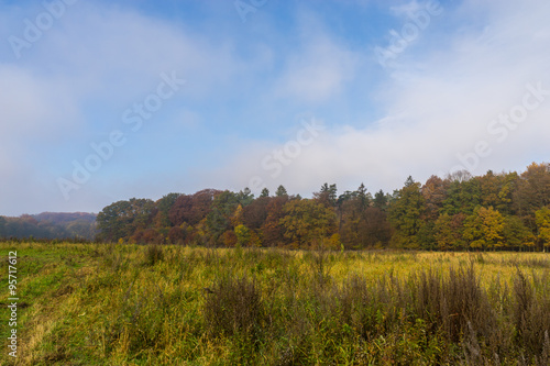© TimSiegert-batcam, Fototapeta premium Wiese im Herbst mit Nebel