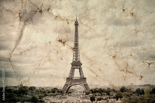 © HappyRichStudio, Obraz premium Wieża Eiffla w Paryżu. Tło widok Vintage. Tour Eiffel stare zdjęcie w stylu retro z pęknięciami zmięty papier. Styl pocztówki.
