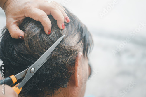 © Dontree, Obraz premium Wife cuts her husband's hair at home in a pandemic situation.