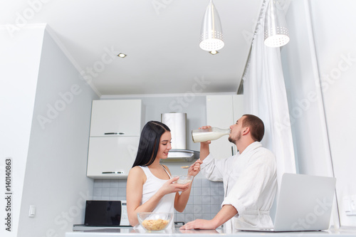 Obraz premium Wife eating porridge and husband drinking milk.
