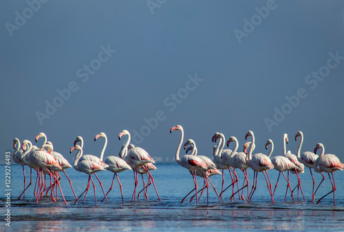 Fototapeta premium Wild african birds. Group of Greater african flamingos walking around the blue lagoon on a sunny day