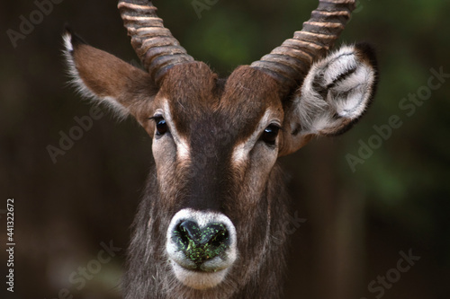 © Yuliia Lakeienko, Fototapeta premium Wild african life. Close up of a cute Waterbuck (the large antelope) looking at the camera and posing in the Savannah.