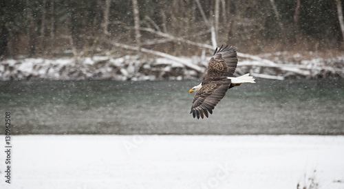 Obraz premium Wild American Bald Eagle in flight over the Skagit River in Wash
