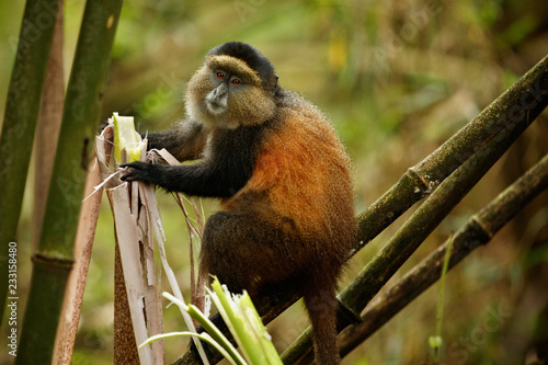 Naklejka premium Wild and very rare golden monkey in the bamboo forest. Unique and endangered animal close up in nature habitat. African wildlife. Beautiful and charismatic creature. Cercopithecus kandti.