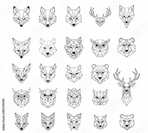 © Putarc, Obraz premium Wild animal faces line art set vector.