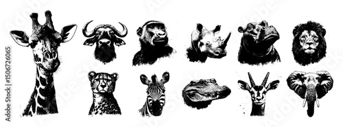 Naklejka premium wild animal heads collection bold black ink drawing