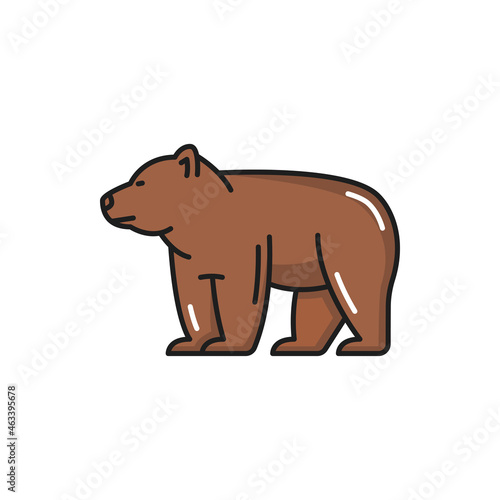 Fototapeta premium Wild animal isolated Swiss brown bear side view, flat line icon. Vector ursus predator, wildlife big beast. Wild animal standing, siberian or american bear. Berne city of Switzerland flag emblem