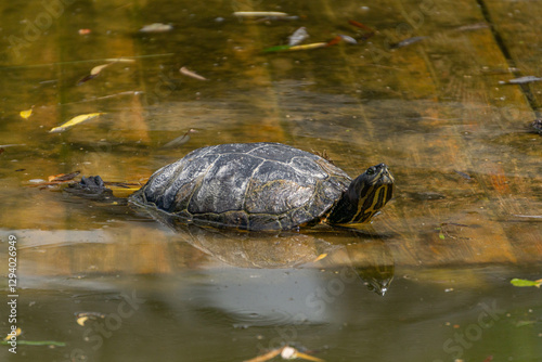 © Adam, Fototapeta premium wild animal reptile, aquatic turtle in the water on a plank platform, pond decoration. beautiful sunny spring day