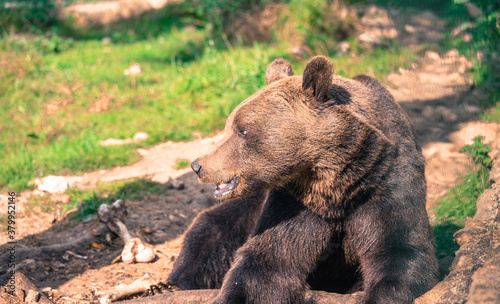 Obraz premium Wild animals. A bear in the forest. Lie down and rest. Dangerous animal,...