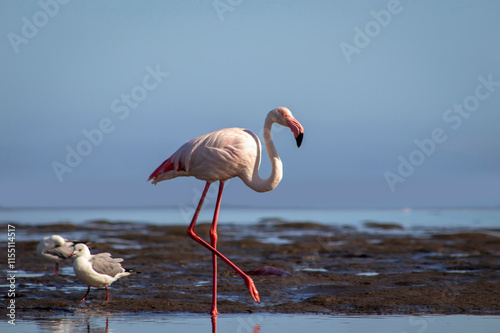 © Yuliia Lakeienko, Obraz premium Wild animals. A great flamingo and two small birds on the blue lagoon