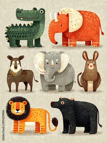 Fototapeta premium Wild Animals Gathering Exotic Safari Creatures Including Tiger Lion Elephant...