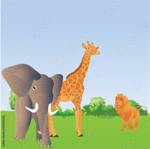Naklejka premium Wild animals in african savanna, elephant, giraffe and lion. Beautiful...