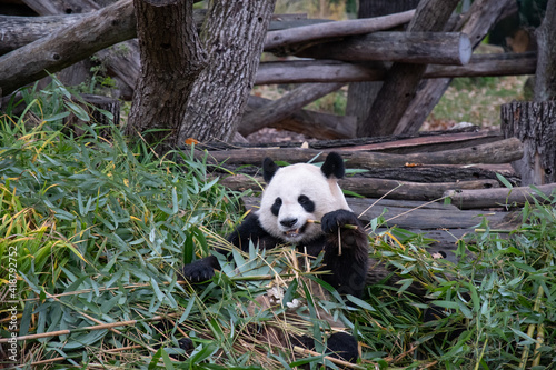 © Ninel, Fototapeta premium Wild animals life. Cute panda bear sits among bamboo leaves and holds branch in paw. Panda eats bamboo in natural habitat environment