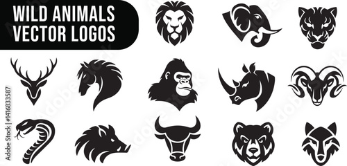 Fototapeta premium Wild Animals silhouette logos set, Animal's head logos, Black and white vector, set of 13 illustration clipart vector art