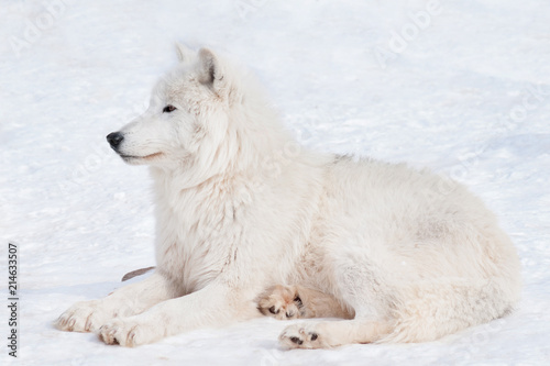 Naklejka premium Wild arctic wolf is lying on white snow. Animals in wildlife. Canis lupus...