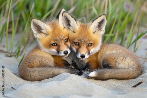 © Dzikrul Husnani, Obraz premium Wild baby red foxes cuddling at the beach, June 2020, Nova Scotia, Canada, ai