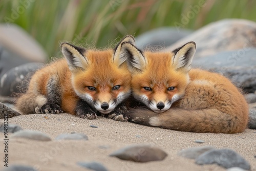 Fototapeta premium Wild baby red foxes cuddling at the beach, June 2020, Nova Scotia, Canada, ai