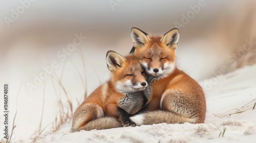 © Riffat, Obraz premium Wild baby red foxes cuddling together on a snowy winter beach with ocean waves in the background, captured in a serene natural setting