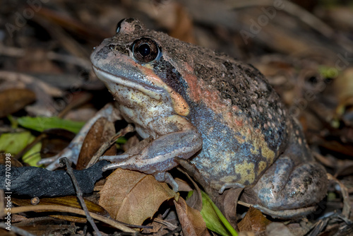 © Andrew, Fototapeta premium Wild Banjo Frog Among Dry Leaves and Soil