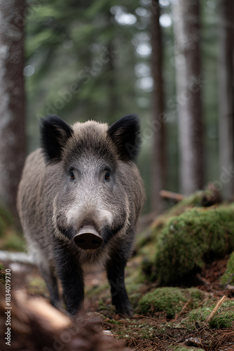 Fototapeta premium Wild boar standing in a lush green forest, surrounded by moss-covered ground...
