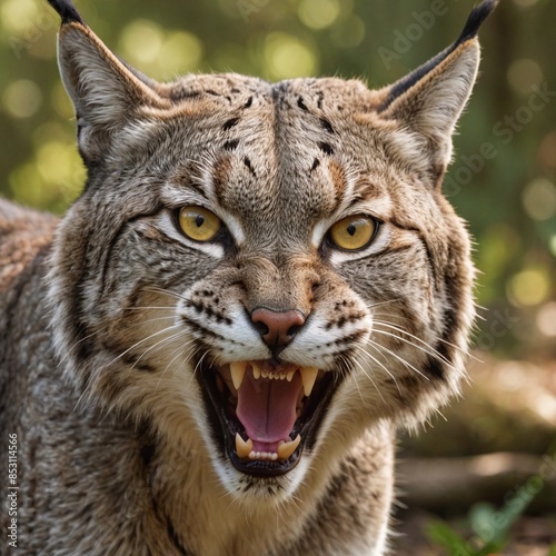 © GMeta, Naklejka premium Wild Bobcat in the Shadows Fierce Predator in Closeup