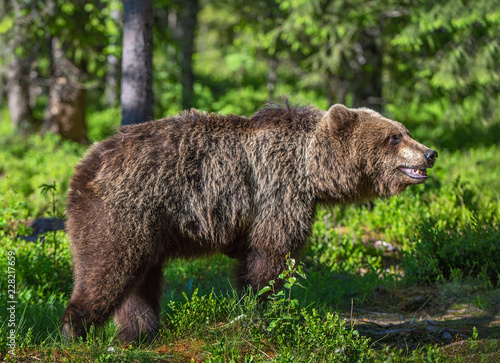 Obraz premium Wild Brown bear in the summer forest. Scientific name: Ursus Arctos.