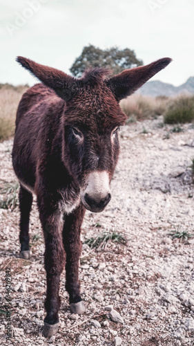 Fototapeta premium Wild brown donkey (from the Mediterranean) on a mountain in Mallorca.