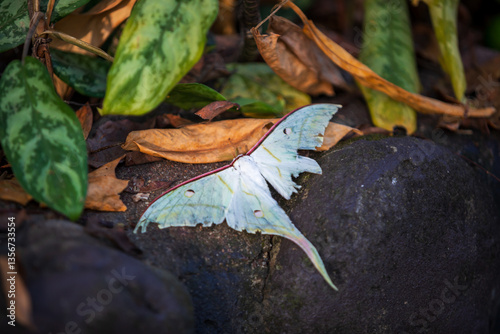 Naklejka premium Wild butterfly in the forest. butterfly in damage wing can not fly.