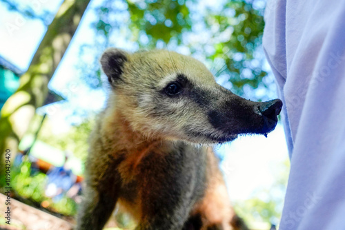 Obraz premium Wild Coati in Iguazu falls walking between the tourist
