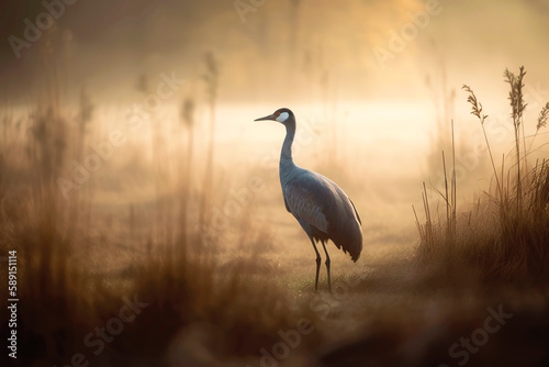 © Francesco, Fototapeta premium Wild common crane, grus grus, walking on hay field in spring nature.