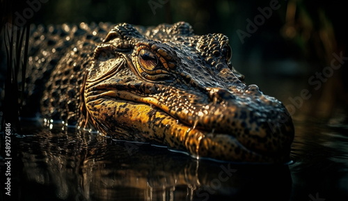Fototapeta premium Wild crocodile is lurking in the forest swamp. Based on Generative Ai.